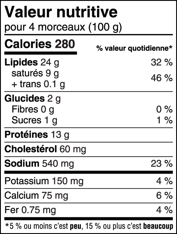 Bouchées de bacon au fromage et au jalapeño : Bacon (porc, eau, sel, phosphate de sodium, érythorbate de sodium, nitrite de sodium, fumée) • Porc • Poivron vert • Fromage mozzarella partiellement écrémé à faible teneur en humidité (lait) • Piment jalapeno • Produit de fromage fondu (fromage, substances laitières modifiées, eau, sel, saveur, bêta-apo-8’caroténal, gélatine, citrate de sodium, phosphate de sodium, cellulose en poudre, sorbate de potassium, acide citrique) • Eau • produit de pois isolé • Ail déshydraté • Épice • Sel • Saveur.